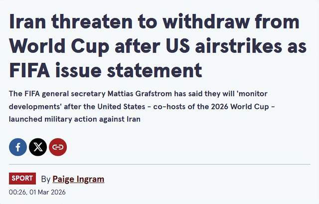 《每日邮报》等媒体指出,由于国内动荡局势,陷入战争的伊朗威胁退出(threaten to withdraw)世界杯。